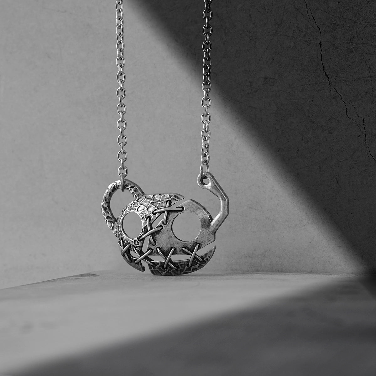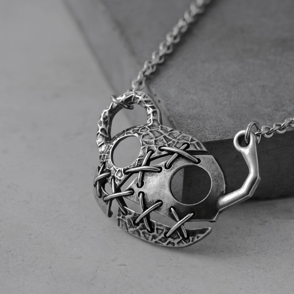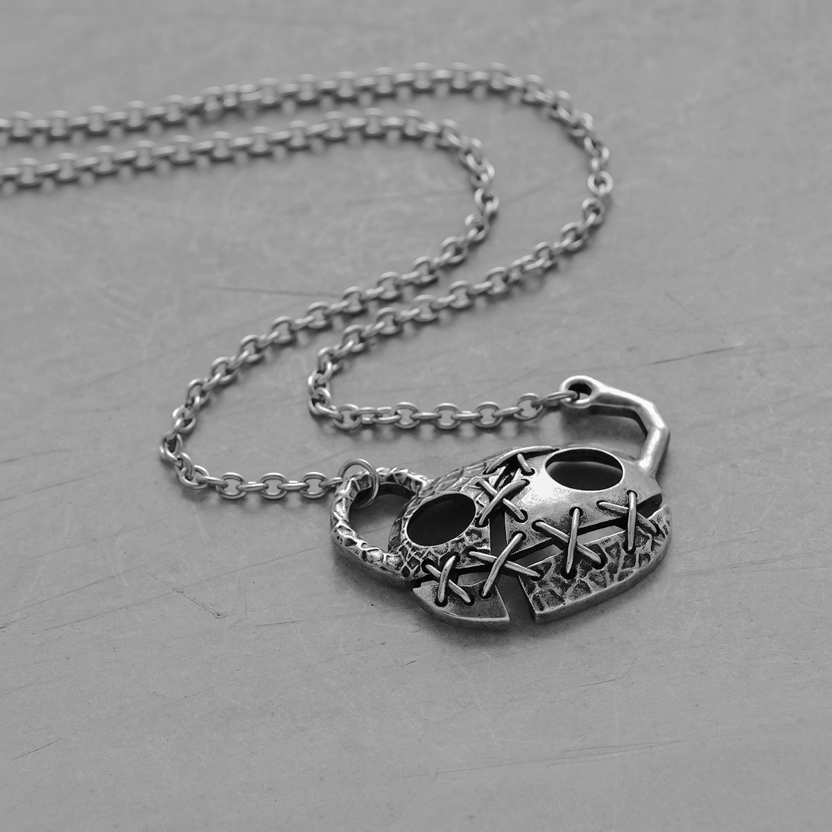 This Stitch Mask Necklace features a unique aesthetic with silver metal that showcases the beauty of fragmentation and stitching, perfectly blending modern and surreal styles to express individuality and artistry. This item is sold individually.